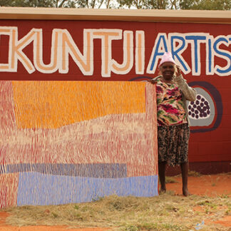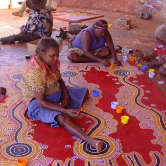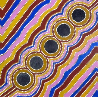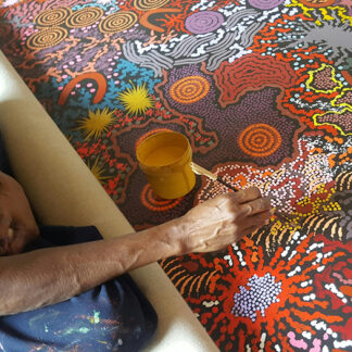 Warlukurlangu is internationally recognised for their bold use of colour and strong traditional iconography. The paintings tell the story of the artists’ connection to their Country, and the creation myths that began in the Dreamtime.
